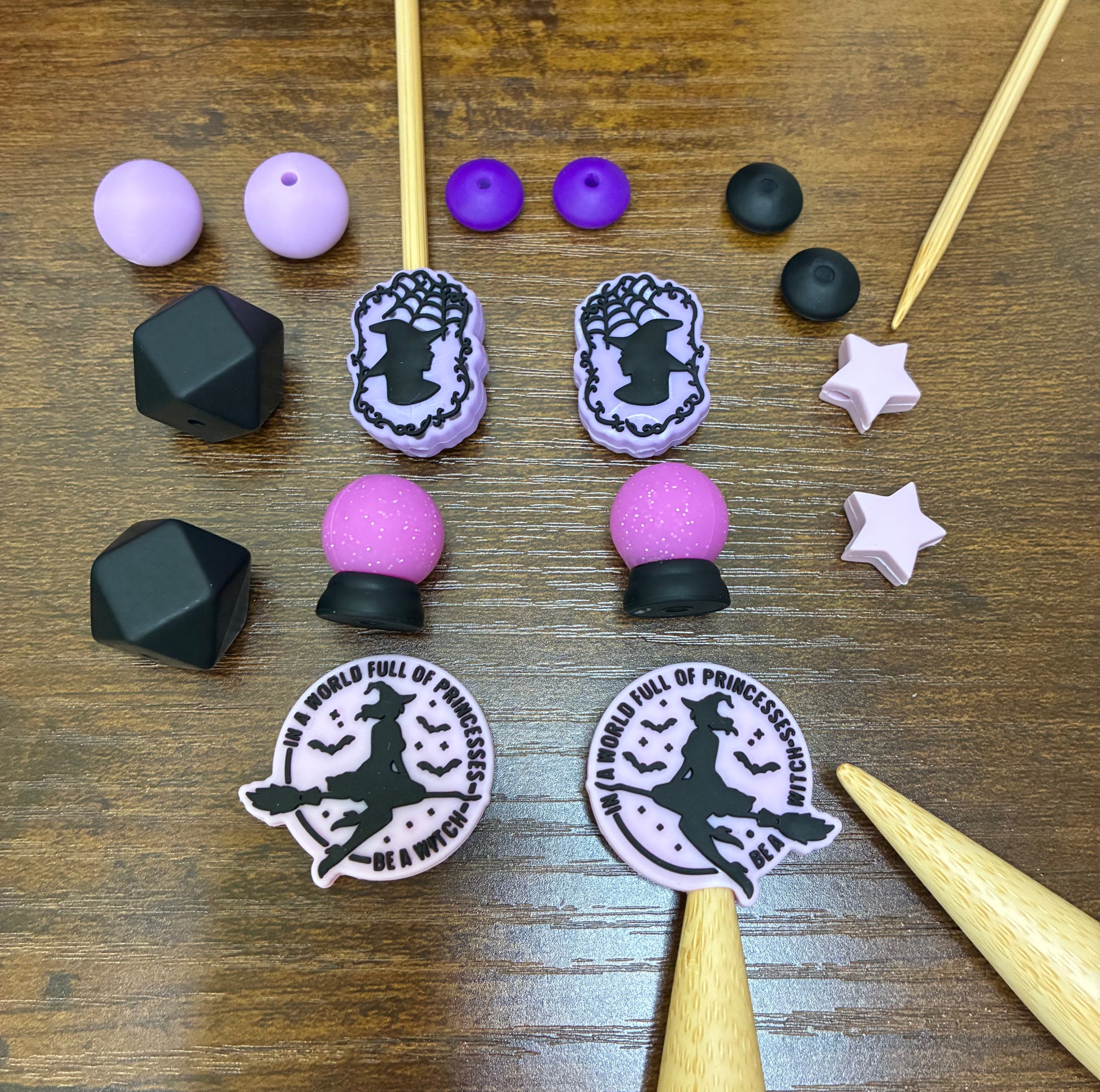 Included in this set: 2 black 17mm hexagon point protectors, 2 15mm round light purple point protectors, 2 Witch profile w/spider web point protectors, 2 crystal ball point protectors, 2 mini star light purple stitch stoppers, 2 black mini 12mm stitch stoppers, 2 dark purple 12mm mini stitch stoppers, and 2 In A World of Princesses Be A Witch point protectors.
