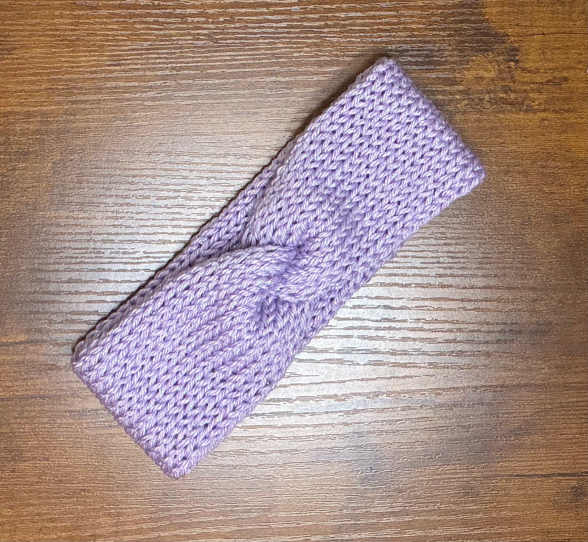 This headband was knit with a hand-turned knitting machine, and was then hand sewn with the twist design. Due to small differences in every yarn texture and color, each piece is unique!