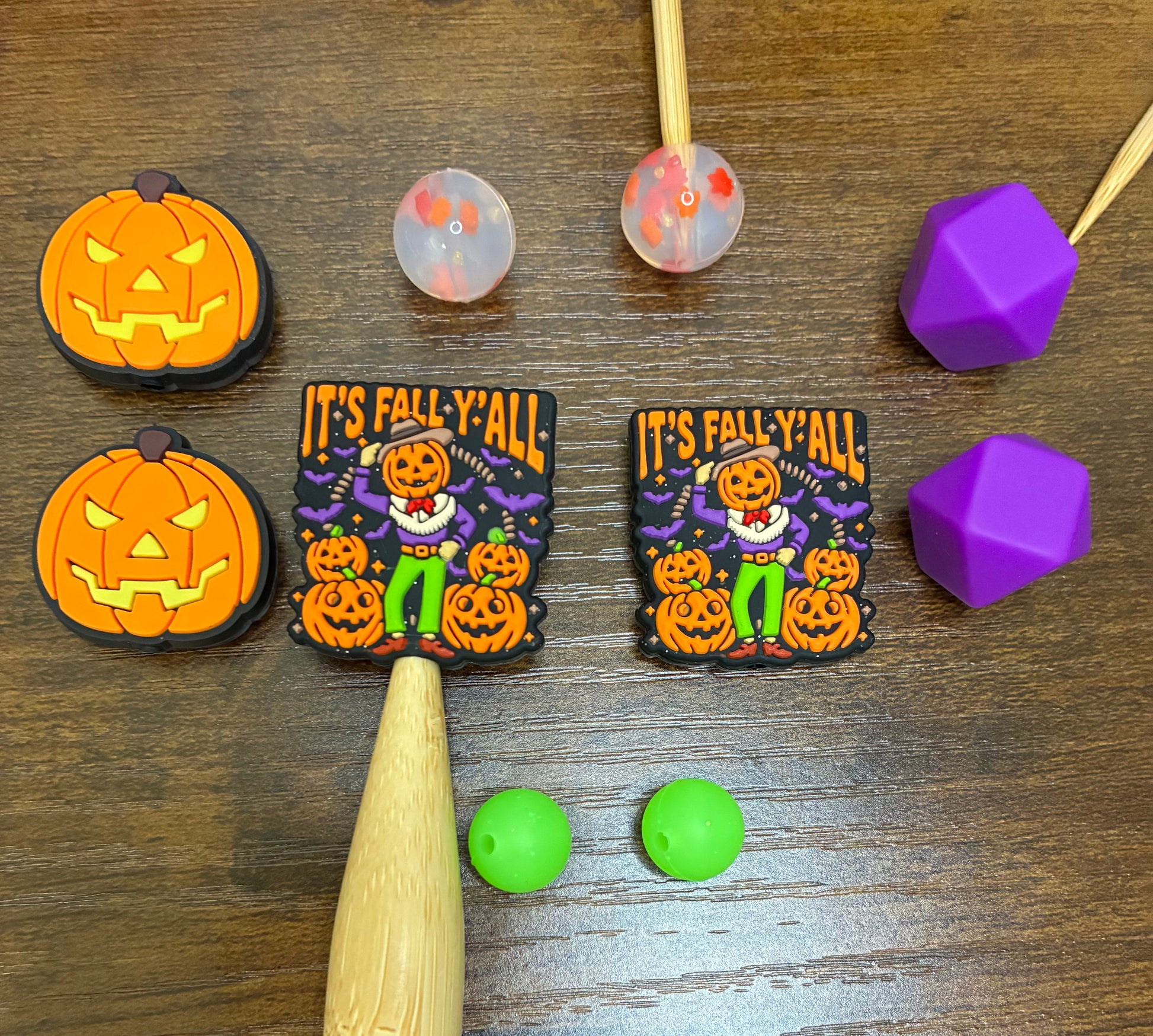 Included in this set: 2 purple 17mm hexagon point protectors, 2 Pumpkin point protectors, 2 It's Fall Y'all point protectors, 2 15mm round see-through with leaves point protectors, 2 green sparkle round stitch stoppers.