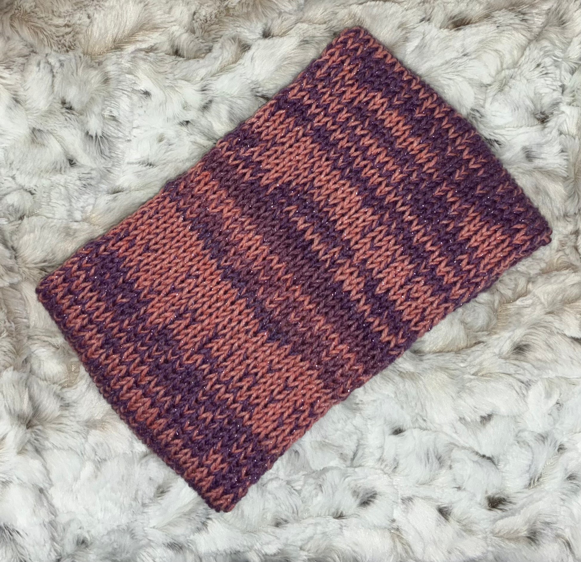 Shades of pink with color shifts to purple and subtle tinsel throughout, this neck warmer is a comfy addition to your collection!