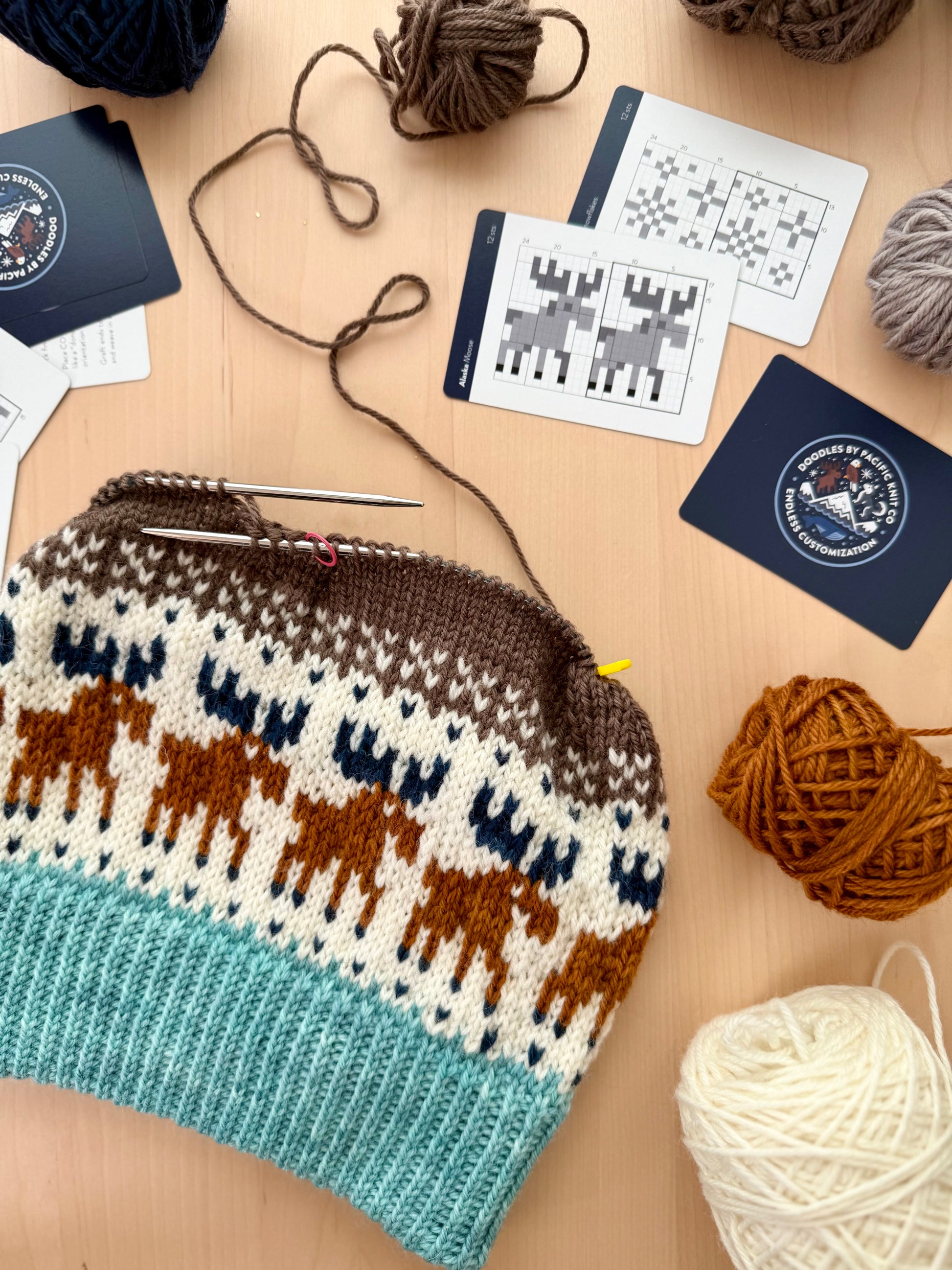 Knit up your favorite Alaskan memories with this Destination Doodle Deck! With this purchase you will receive a physical pack of 13 Alaska-themed colorwork charts, infinity cowl base pattern instructions, and a "How to Doodle" instruction card, which are conveniently sized (2.5"x3.5") for on the go knitting. Take it with you on that Alaskan cruise, to knit in your downtime!