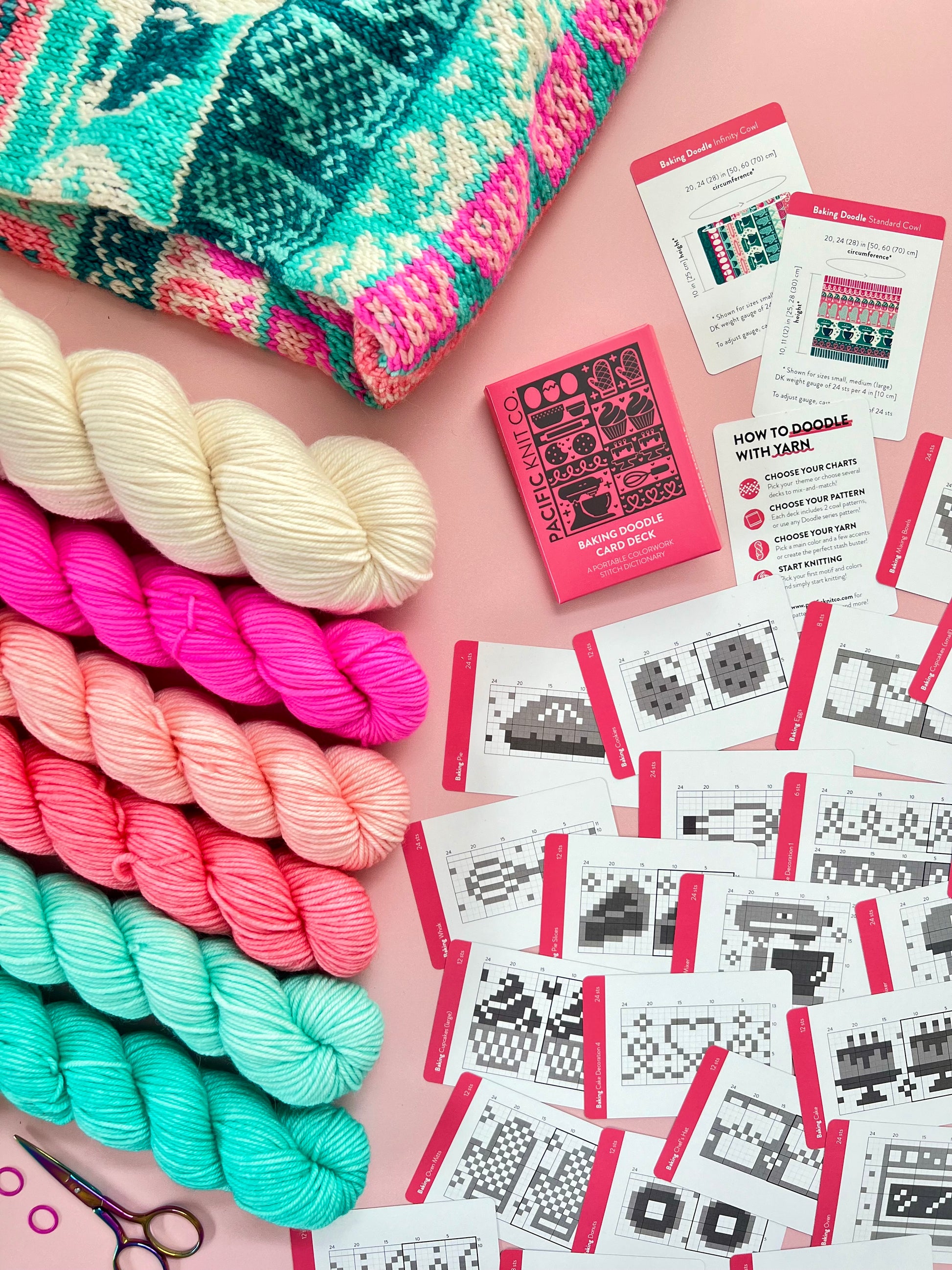 Bakers, unite! You "knead" this Baking Doodle Deck to knit some yummy motifs! With this purchase you will receive a physical pack of 24 baking-themed colorwork charts, infinity cowl base pattern instructions, and a "How to Doodle" instruction card, which are conveniently sized (2.5"x3.5") for on the go knitting.