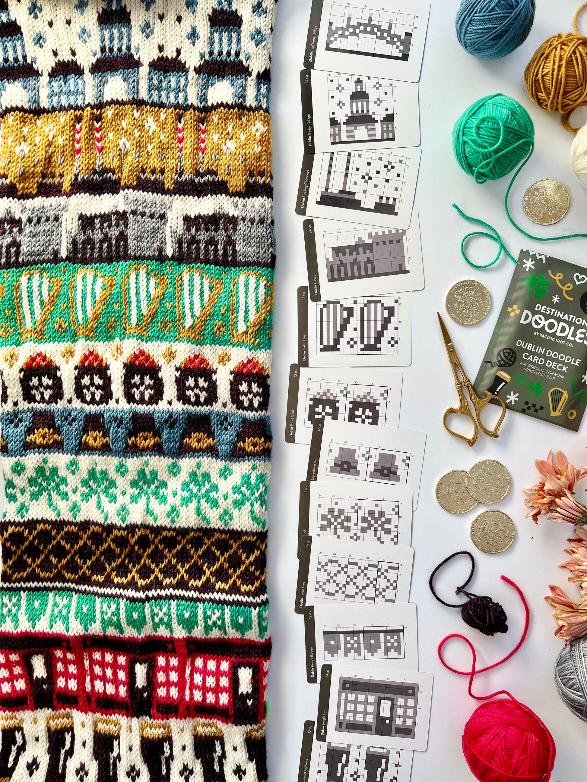 Knit up your favorite Dublin memories with this Destination Doodle Deck! With this purchase you will receive a physical pack of 13 Dublin-themed colorwork charts, infinity cowl base pattern instructions, and a "How to Doodle" instruction card, which are conveniently sized (2.5"x3.5") for on the go knitting!