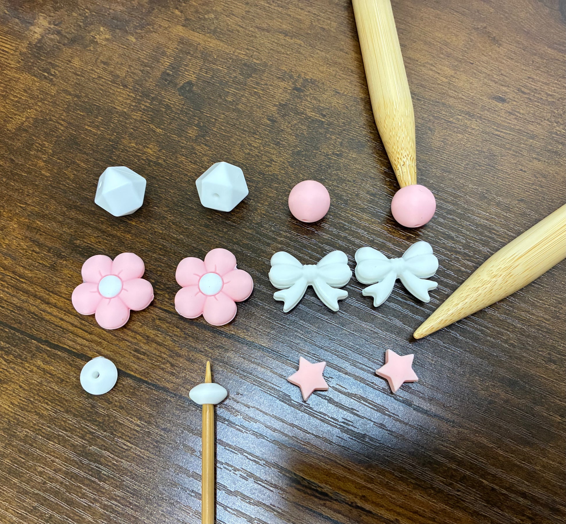 Included in this set: 2 white bow point protectors, 2 white 14mm hexagons, 2 15mm light pink round protectors, 2 pink with white center daisy point protectors, 2 mini white 12mm stitch stoppers, and 2 light pink mini star stitch stoppers.