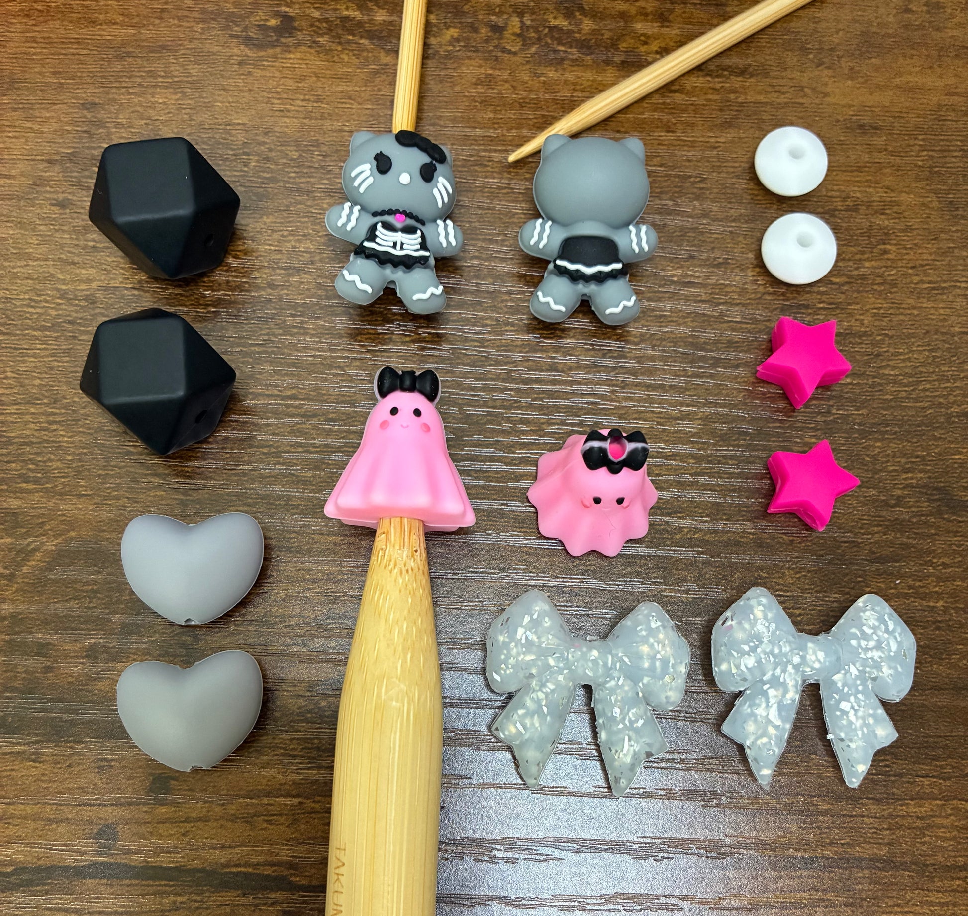 Included in this set: 2 black 17mm hexagon point protectors, 2 grey heart point protectors, 2 Hi Spooky Cat point protectors, 2 Pink Ghost point protectors, 2 bow with silver sparkle point protectors, 2 hot pink mini star stitch stoppers, 2 white 12mm mini stitch stoppers. .